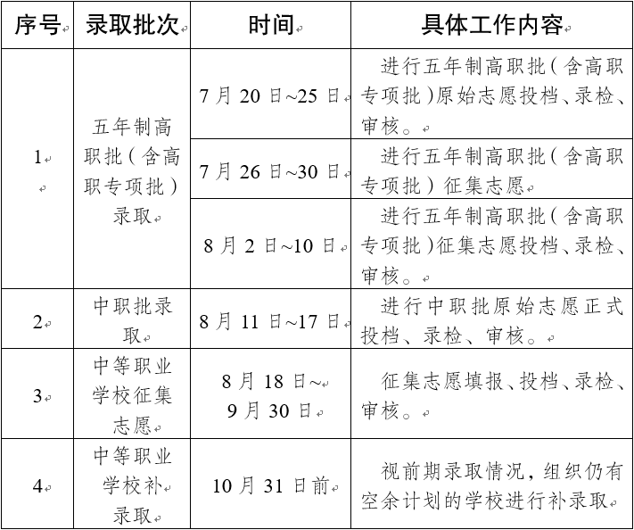 2021年中等職業(yè)學(xué)校秋季招生網(wǎng)上錄取工作從7月20日起至10月31日止,分四個(gè)階段進(jìn)行。主要時(shí)間安排如下: