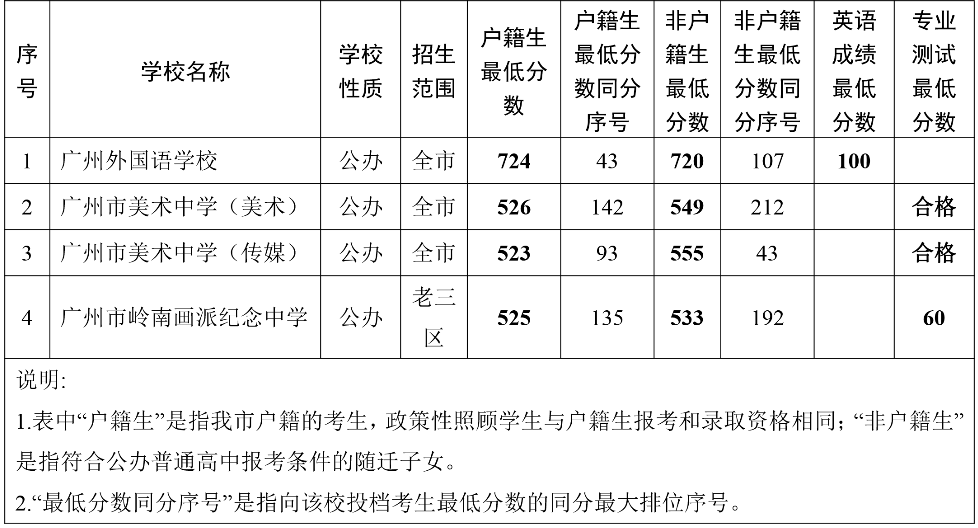 2021年廣州市高中階段學(xué)校招生第一批次錄取工作于8月1日進(jìn)行,現(xiàn)將錄取分?jǐn)?shù)公布如下: