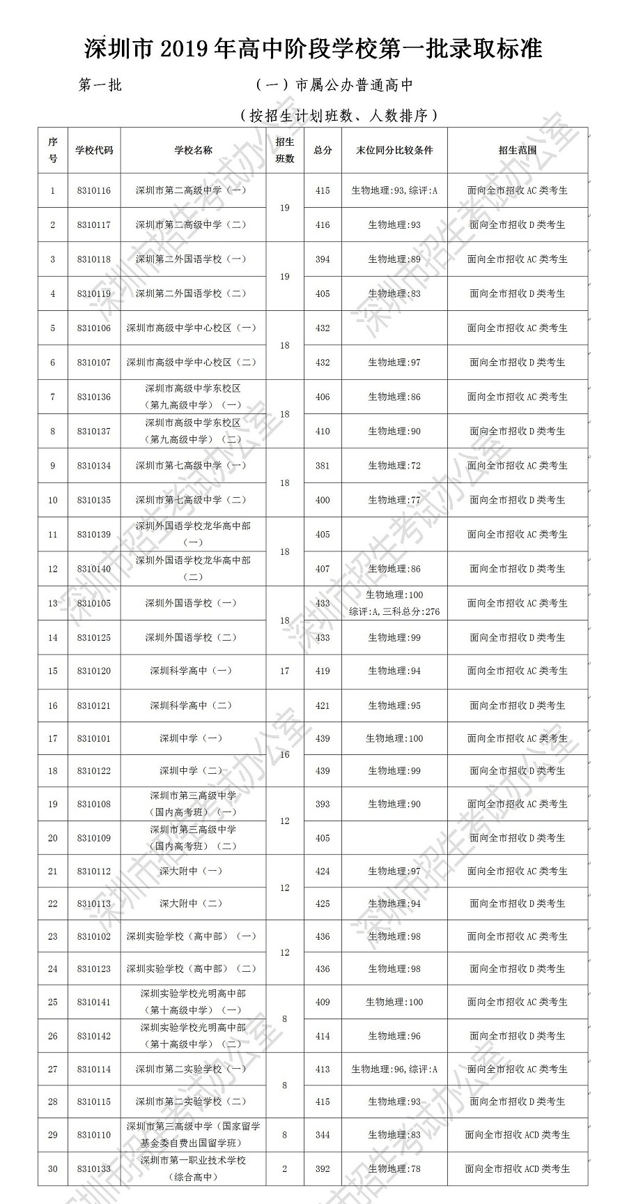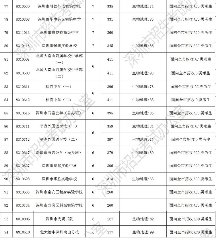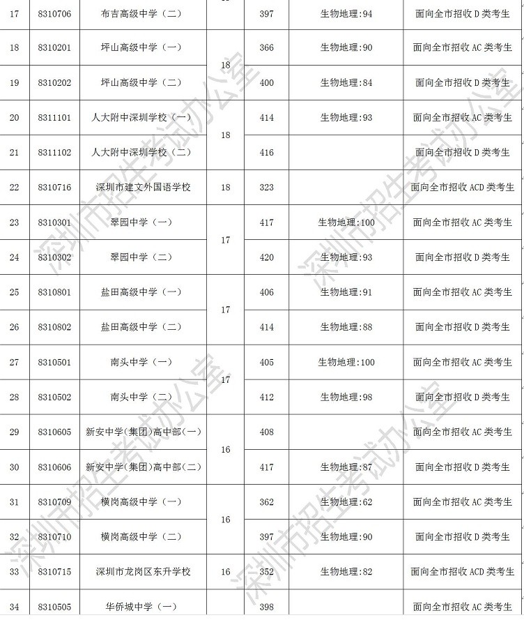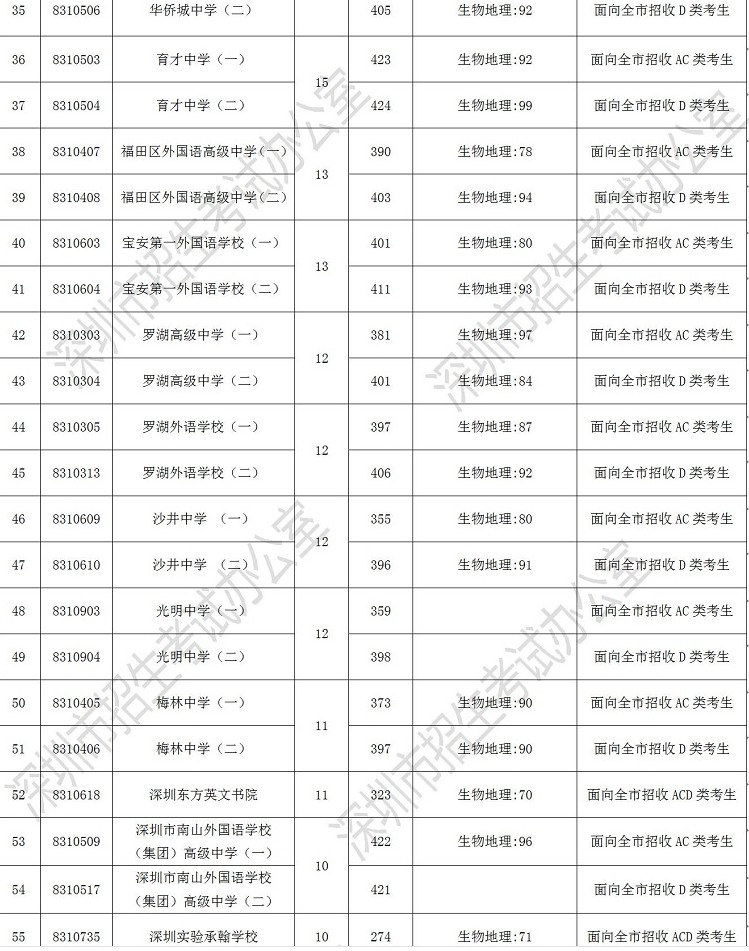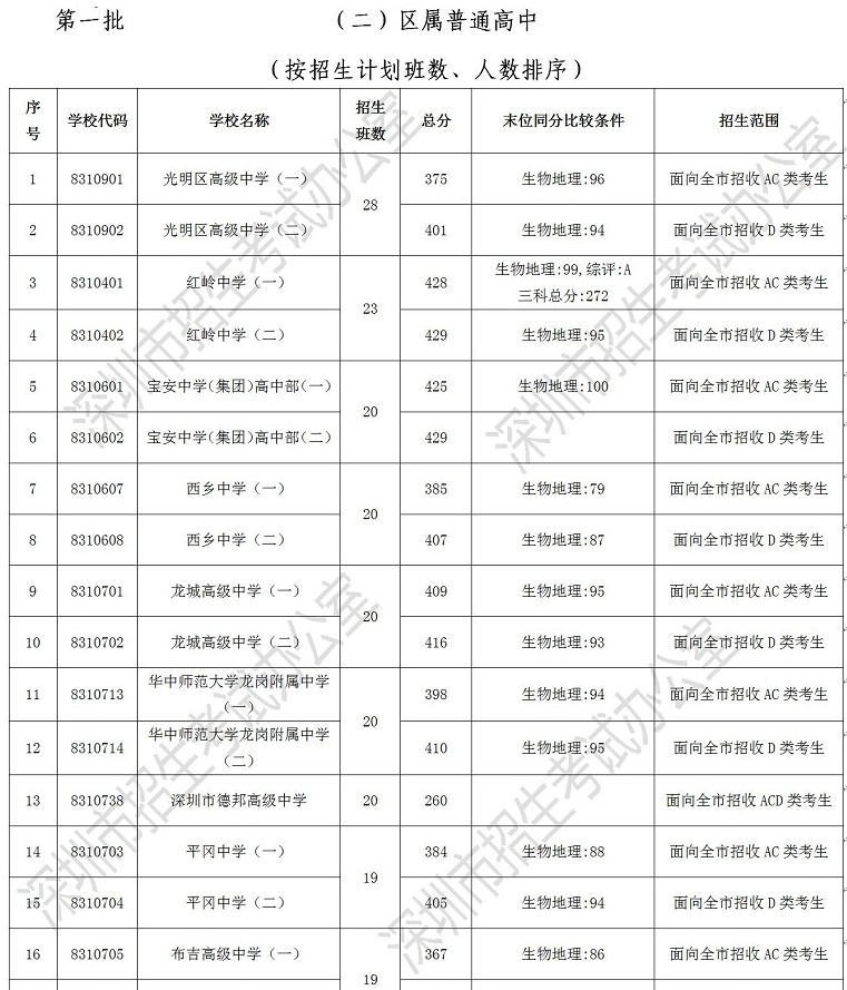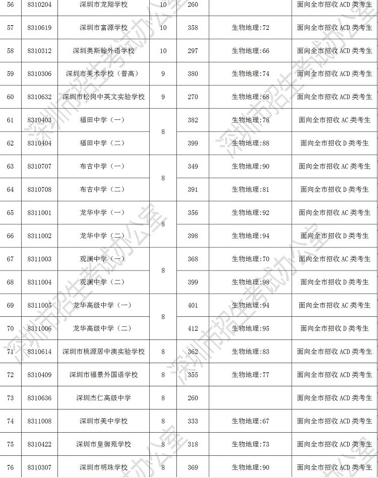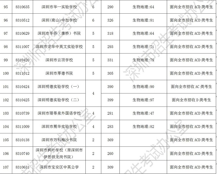 2019年深圳市高中階段學校第一批錄取標準