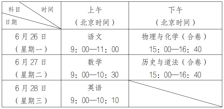 3.語(yǔ)文、數(shù)學(xué)、英語(yǔ)、物理與化學(xué)(合卷)、歷史與道法(合卷)考試于6月26日至28日進(jìn)行。