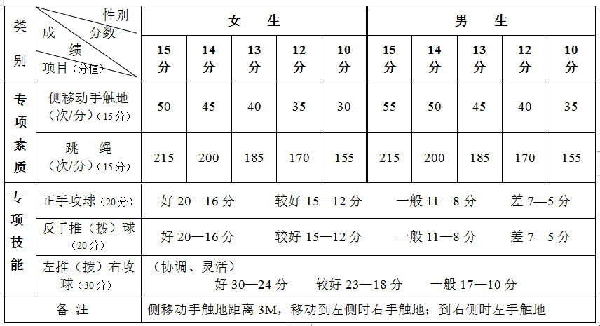 1、乒乓球項(xiàng)目考核內(nèi)容及評(píng)分標(biāo)準(zhǔn)